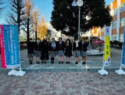 1月8日(木)、3学期の始業式の日に桜華インターアクトクラブは、厳寒の下、地域に対する社会奉仕の一環として新年あけて初めての「あいさつ+ひと事運動」を行いました。