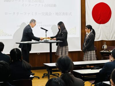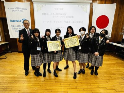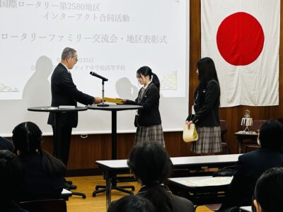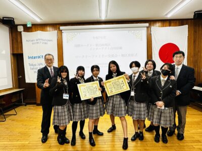 さらに、第二部では、まもなく卒業を迎えるインターアクター3年生の地区合同表彰式も行われました。各校のインターアクターが表彰されるなか、桜華インターアクトクラブからは、当日参加した副会長ら2名が、提唱ローリータリークラブである東京東村山ロータリークラブの方から感謝状と記念品をそれぞれ授与されました。