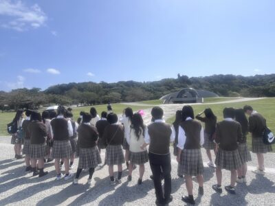 見学後のバスでは、ガイドの方から沖縄戦についてさらに詳しいお話を伺いました。見学前とは雰囲気も変わり、生徒たちは静かに耳を傾けながら、それぞれが平和について思いを巡らせている様子でした。今回の平和学習は、戦争の怖さを肌で感じるとともに、平和の尊さについて深く考える大変貴重な時間となりました。
