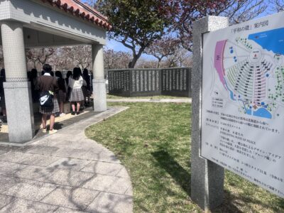 園内は静けさに包まれ、厳かな雰囲気に満ちていました。映像資料や手記、慰霊碑を前にすると、当時この地で起きた出来事の重みが胸に迫ります。生徒たちも自然と足取りをゆるめ、言葉少なに見学をしていました。普段は賑やかな生徒たちも、この場所では神妙な面持ちで資料に見入り、戦争がもたらす悲惨さや、人々の命や日常が一瞬にして奪われてしまう恐ろしさを実感している様子でした。